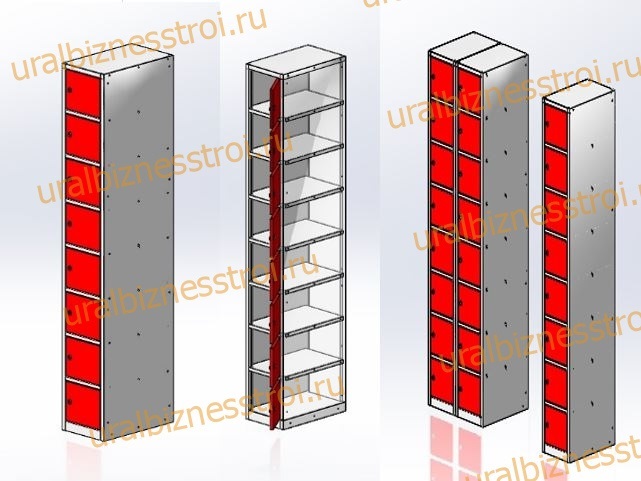 • Модульный шкаф для сумок ШРСо/д-8 имеет стандартную ширину 300 либо 400мм состоит из одной вертикальной секции, 8 ячеек с 8 дверями.