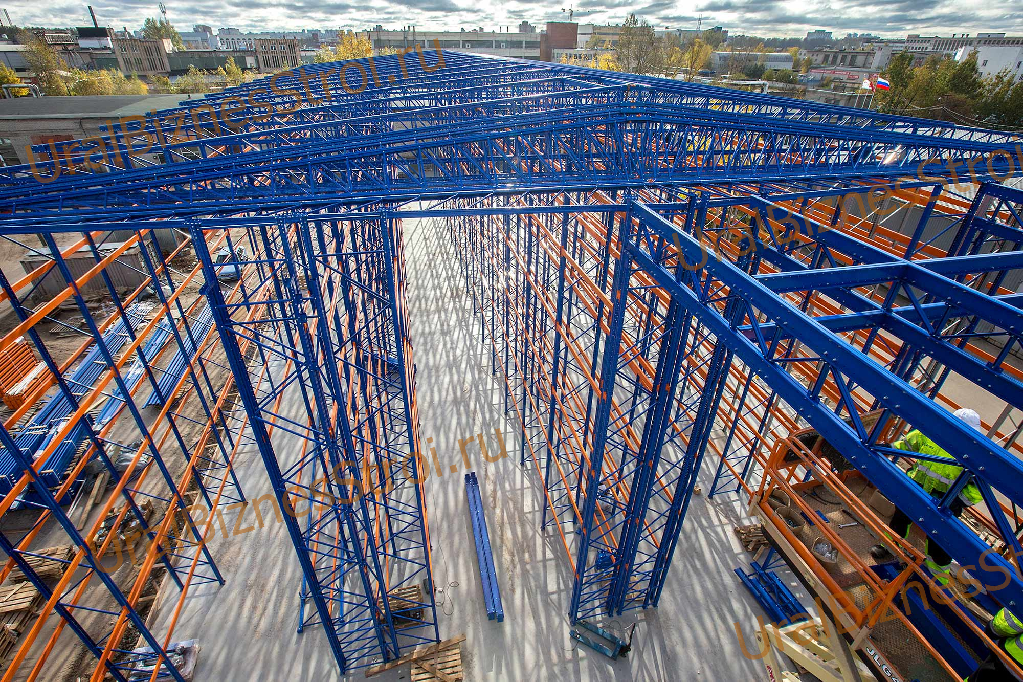 Быстровозводимый склад 18000х28000*10000 мм 4 яруса. На две наклонные фермы.