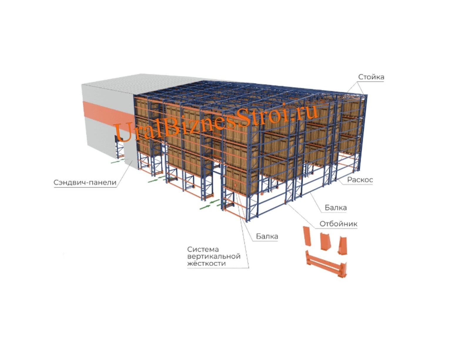 Каркас стеллажей выполнен из стальных стоек, обеспечивающих надежность и легкость конструкции. Крыша монтируется на стропильные фермы, а далее крепится крыша с кровлей. Для соединения элементов используются болты и зацепы, без сварных швов. Ворота склада можно сделать распашными, откатными, подъемными.