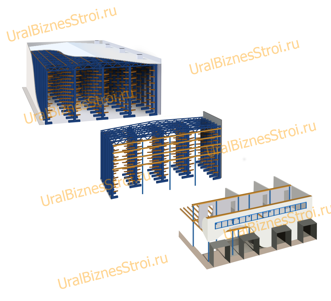 Самонесущий консольный склад 12000*15000*8000мм 7 консолей под наклонные фермы.
