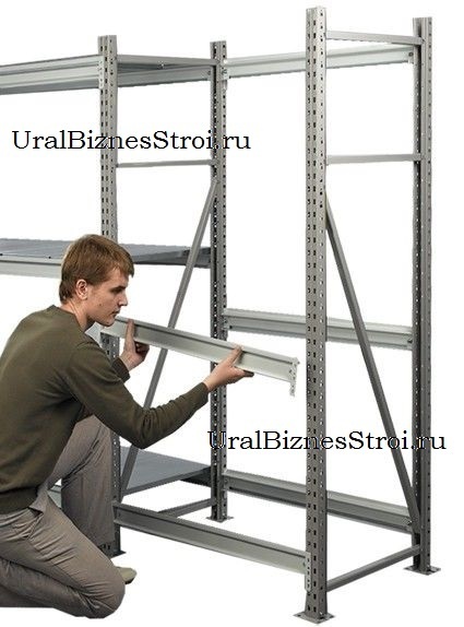 Конструкция стеллажей состоит из сварных рам, горизонтальных балок и полок. Балки фиксируются на рамах с помощью зацепов и оснащены дополнительными фиксаторами. Сверху на них укладываются полки, которые могут быть либо окрашенными, либо оцинкованными.