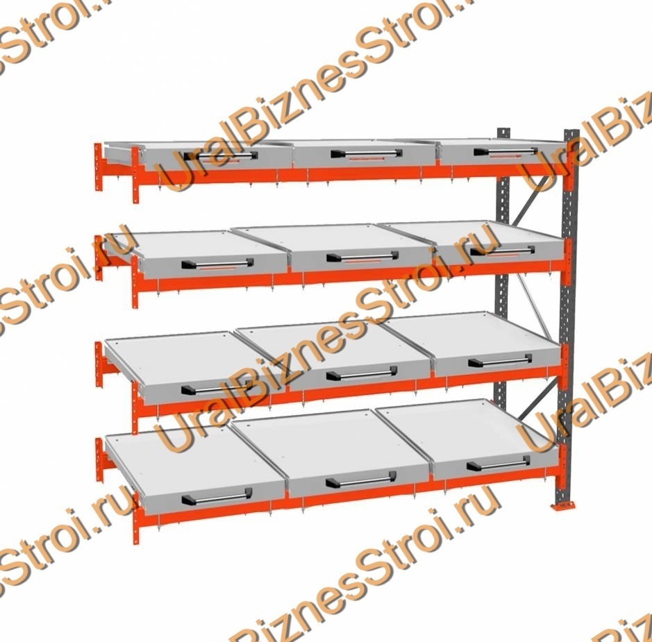 Стеллаж с выкатными платформами дополнительная секция 2500*2700*1050 4 яруса 12 платформ