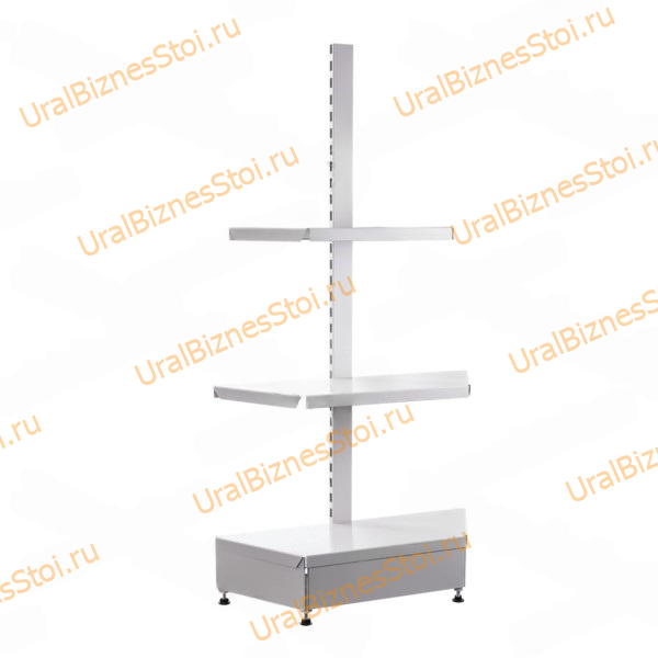 Стеллаж приставляют в торговом зале к линии островного стеллажа – так создаётся единая система для хранения и демонстрации товара. По высоте и комплектации полок стеллажи должны соответствовать друг другу.